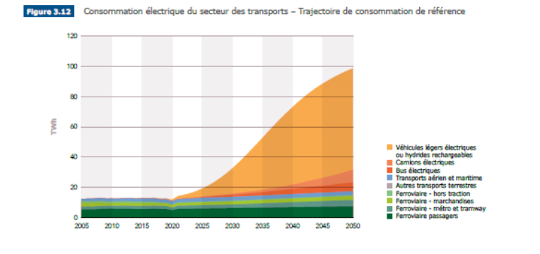 Encore plus parlant peut-être, on peut également comparer ces chiffres au scenario “Futurs énergétiques 2050” de RTE, qui, dans sa version originale, prévoyait en tout et pour tout 100 TWh d’électricité allouée au transport, une grande partie étant prévu pour… les voitures électriques.
