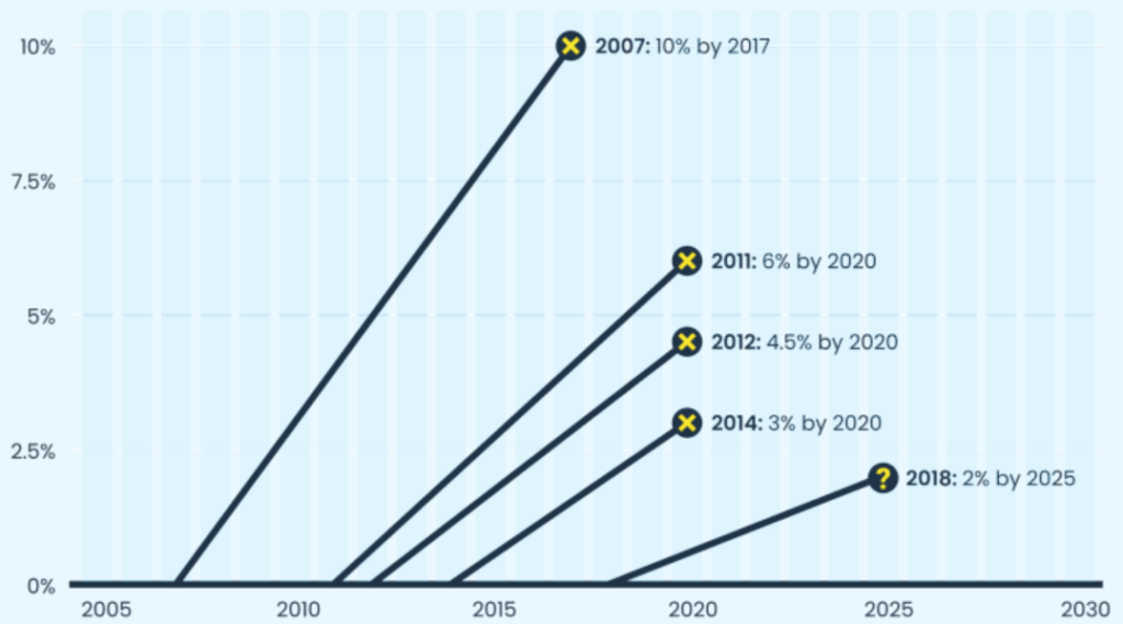 Il faut ici bien réaliser ce qu’est un objectif raté d’un facteur 1.000 : imaginez que vous créiez votre propre entreprise, et promettez au banquier un chiffre d’affaires de 1.000.000€ d’ici 10 ans. Vous revenez 10 ans plus tard et vous avez généré… 1.000€. Mais vous accusez le marché, les gouvernements, les compagnies qui n’en font pas assez. Derrière, vous promettez au banquier des chiffres encore plus ubuesques, et devinez quoi, celui-ci vous déroule le tapis rouge !