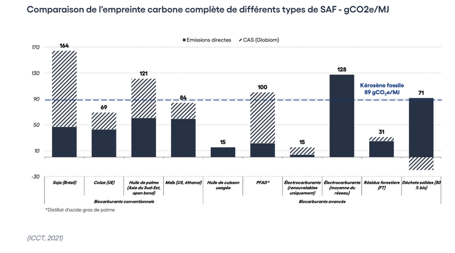 Rappelons d’abord, que dans l’analyse de l’impact environnemental du SAF, il est nécessaire de considérer à la fois les émissions directes (combustion) et les émissions indirectes (exemple l’huile de palme qui contribue à la déforestation en Indonésie), cf le graph ci-dessous.