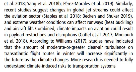 On retrouve ici le lien entre réchauffement climatique et turbulences : “les études ont indiqué que la quantité de turbulences modérées ou importantes en air libre sur les routes aériennes transatlantiques en hiver augmentera considérablement à l’avenir en raison du changement climatique“.