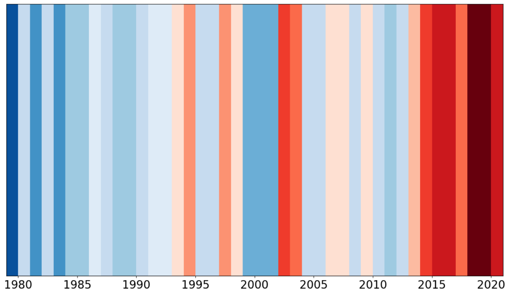 Ed Hawkins, le célèbre climatologue auteur des bandes du climat (warming stripes) en a profité pour créer de nouvelles bandes montrant l’augmentation des turbulences modérées en air clair dans l’Atlantique depuis 1979 :