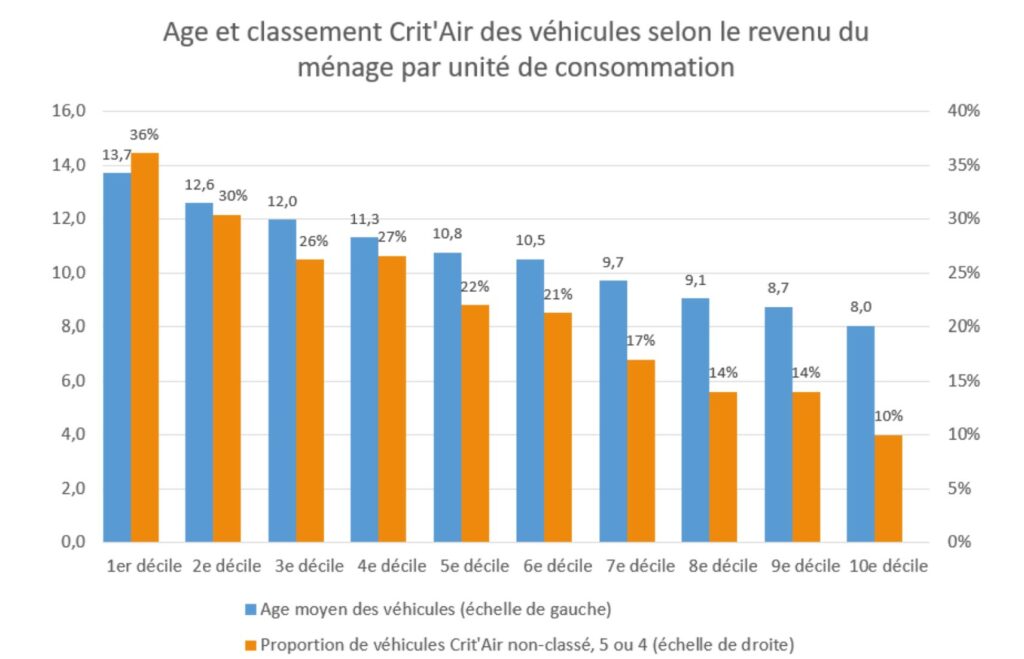 A titre de comparaison, les ménages du 10e décile possèdent des voitures plus récentes (8 ans en moyenne en 2019) et beaucoup moins impactées par les ZFE puisque seulement 10% d’entre elles étaient Crit’Air 4, 5 ou non-classées en 2019.