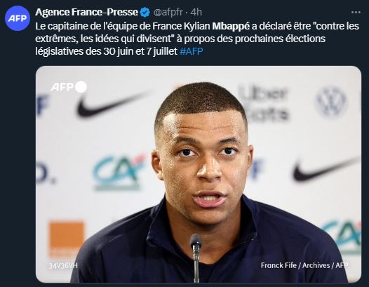 Le choix de la photo pour illustrer cet article n’est pas un hasard. 24h après que le joueur de l’équipe de France de football Marcus Thuram déclare ‘il faut se battre pour que le RN ne passe pas“, Kylian Mbappé s’est lui aussi positionné en déclarant « Je suis contre les extrêmes, contre les idées qui divisent. »