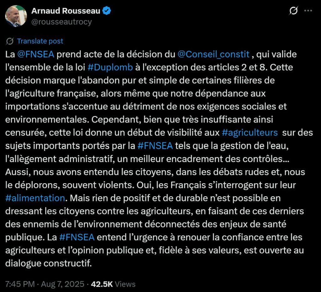 Autre point qui mérite attention, la réaction d’Arnaud Rousseau, président de la FNSEA et directement concerné par la loi Duplomb via ses activités dans le groupe AVRIL :