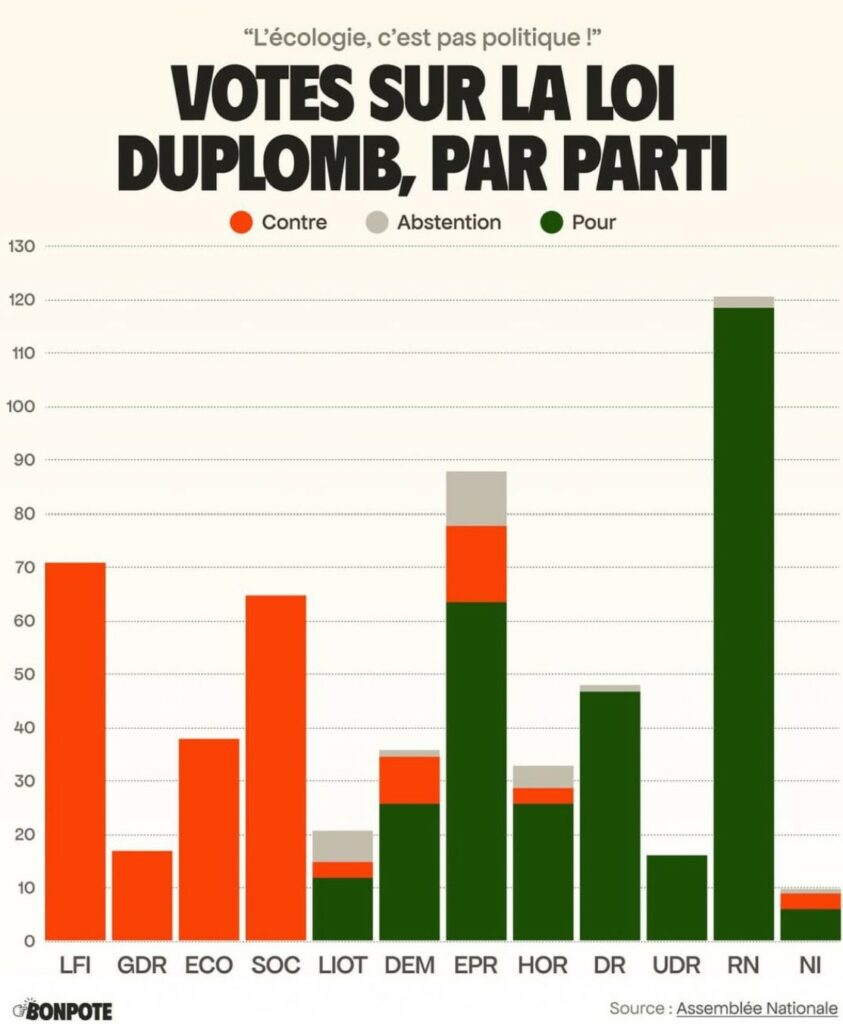 Un parallèle entre la promulgation de la loi Duplomb et les législatives 2024 pourrait être fait. Les partis de gauche rassemblés au sein du NFP étaient alors arrivés en tête des législatives et criaient victoire.