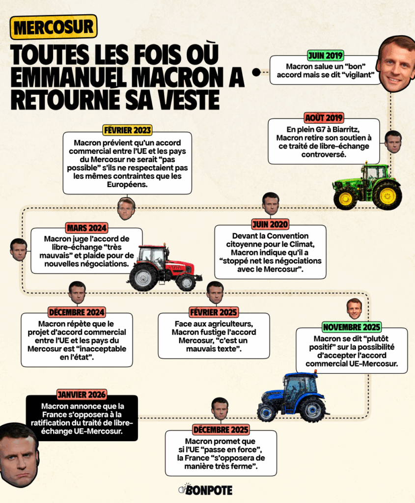 Difficile de garder le fil, mais la chronologie ci-dessous nous aide à y voir un peu plus clair. En 2019, l’UE et le Mercosur aboutissent à un “accord de principe”. “L’essentiel de l’accord, tel qu’on le connaît aujourd’hui, est alors finalisé dans son contenu”, précise Maxime Combes Emmanuel Macron est alors président depuis deux ans et en juin 2019, il se dit favorable au traité, jugeant qu’il s’agit là d’un “bon accord”.