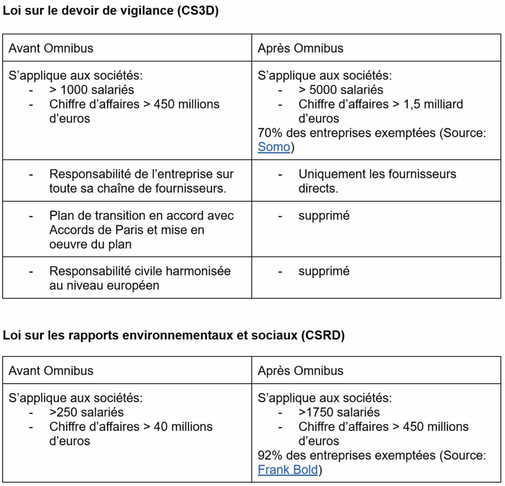 En avril dernier, huit ONG (Coalition européenne pour la justice des entreprises, ClientEarth, Notre Affaire À Tous, Clean Clothes Campaign, Global Witness, T&E, Anti-Slavery International et Friends of the Earth Europe) ont déposé une plainte officielle auprès de la médiatrice européenne, arguant que « la proposition Omnibus a été élaborée sans aucune consultation publique, marginalisant la société civile, manquant de preuves et d’évaluations d’impact environnemental et social, et privilégiant les intérêts étroits de l’industrie. »