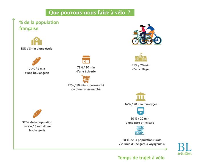 9 élèves d’école primaire sur 10 habitent à moins de 8 minutes à vélo d’une école. 4 collégiens sur 5 habitent à moins de 20 minutes à vélo d’un collège. 2 lycéens sur 3 sont situés à moins de 20 minutes d’un lycée. Les 3/4 de la population française habite à moins de 10 minutes à vélo d’un hypermarché ou d’un supermarché et 4 Français sur 5 habitent à moins de 5 minutes d’une boulangerie à vélo.