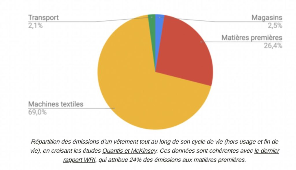 Or, environ les 2/3 des émissions du secteur textile proviennent de l’énergie consommée par les machines qui transforment la matière en vêtement (filature, teinture, tissage, ennoblissement, lavage…) dans les lieux de production, notamment car la production a majoritairement lieu dans des pays d’Asie au mix énergétique fortement carboné. Les émissions liées aux matières premières, magasins et bureaux sont secondaires.