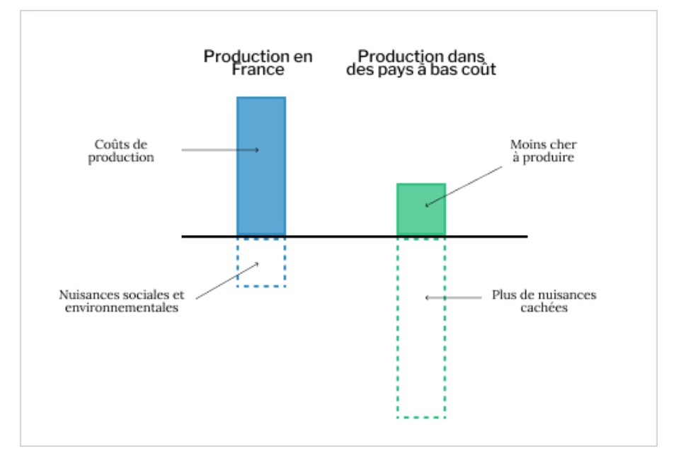 Les usines de vêtements de Chine ou au Bangladesh fabriquent à des prix très bas, surtout parce qu’on y paye les gens des salaires de misère, que les normes environnementales y sont moins strictes, voire inexistantes, et qu’on fait tourner les usines avec des énergies ultra-carbonées bon marché (exemple : du gaz russe en Chine ou au Bangladesh).