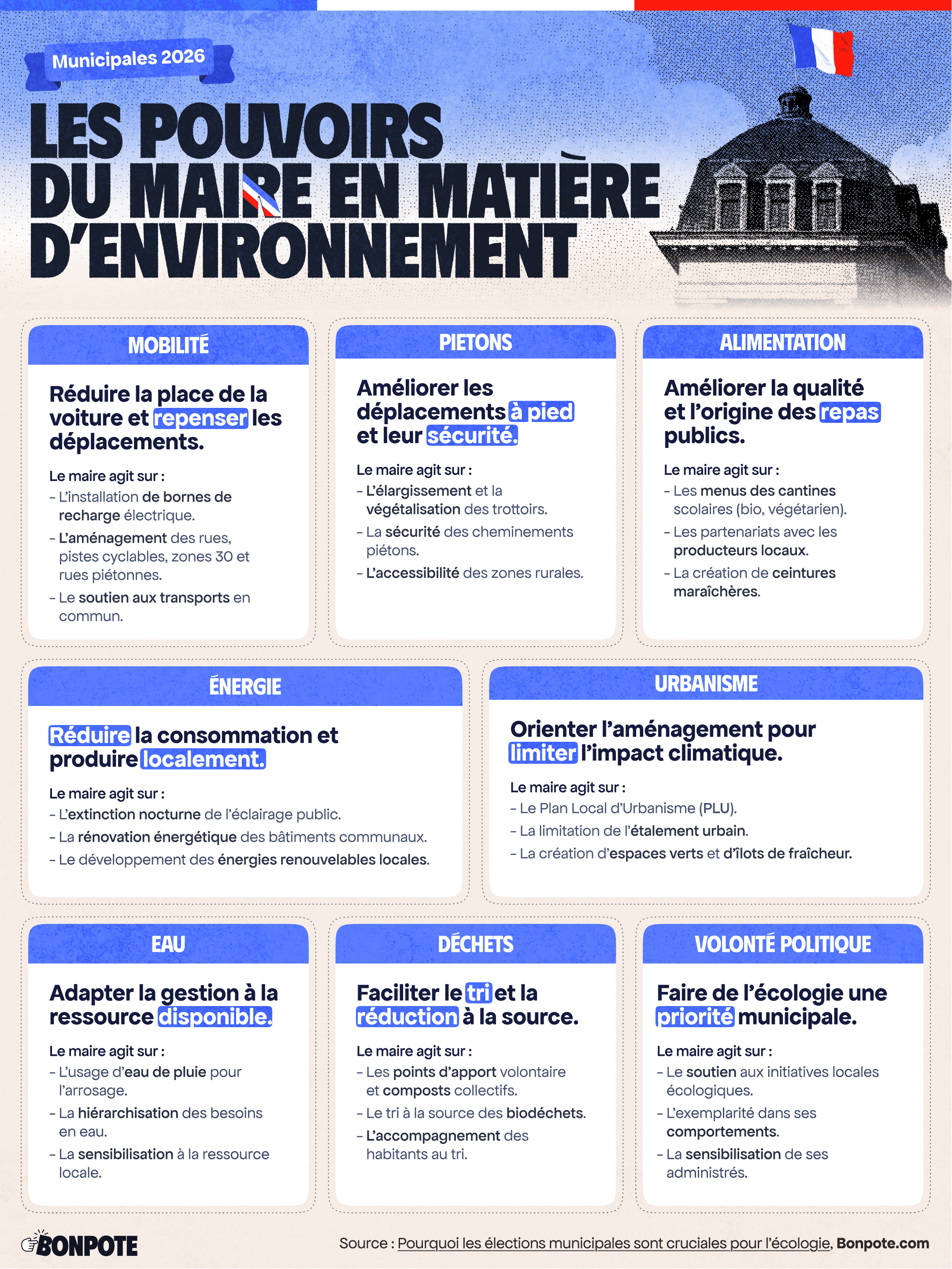 Transports, végétalisation, alimentation… En matière de lutte et d’adaptation contre le changement climatique, les maires ont un rôle majeur. Voici une sélection de leurs compétences pour que vous puissiez mieux les connaître, mais également interpeller les candidat(e)s afin qu’ils et elles soient les plus ambitieux possible, en vue des élections municipales des 15 et 22 mars 2026.