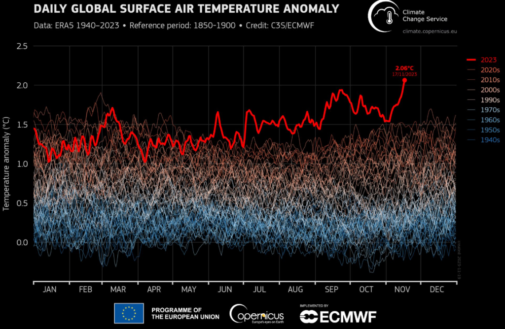 Il appelle également à prendre avec précaution les données journalières, comme ici avec les données ERA5 (ECMWF) où pour la première fois, la planète Terre aurait franchi le 17 novembre 2023 la barre des +2°C de réchauffement mondial, par rapport à la période de référence 1850-1900 :