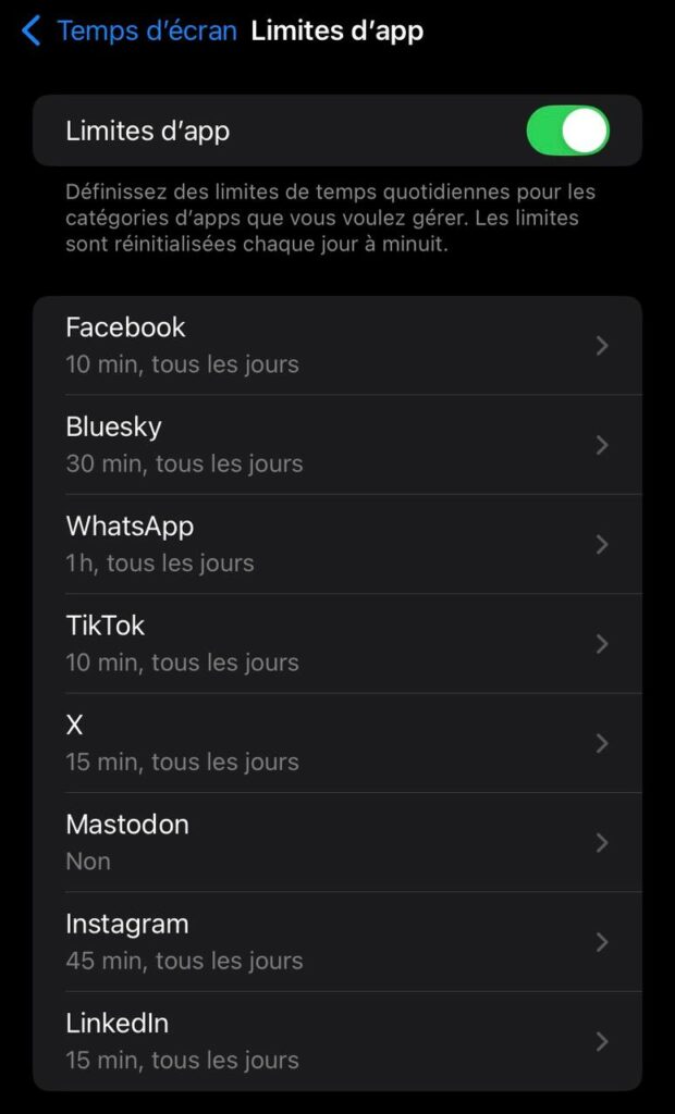 Sur votre smartphone, vous avez la possibilité de limiter le temps passé sur chaque app. Cela peut paraître stupide, mais c’est assez efficace. Testez, vous verrez !