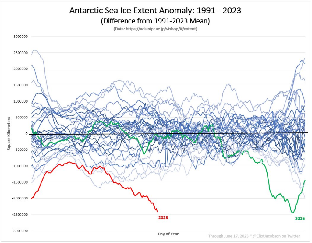 Un autre cas concret de communication risquée est l’Antarctique. Au début de l’été 2023, un graphique représentant l’étendue de la glace de mer en Antarctique a beaucoup circulé sur les réseaux sociaux, avec des personnes (probablement bien intentionnées) qui pointaient du doigt le rôle du changement climatique.